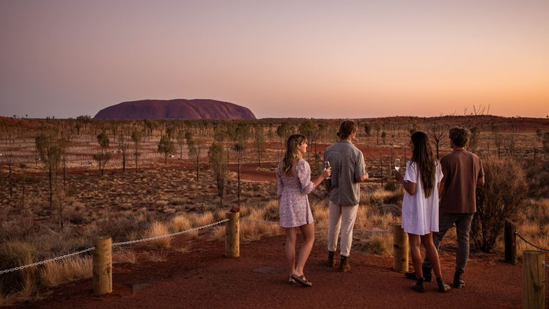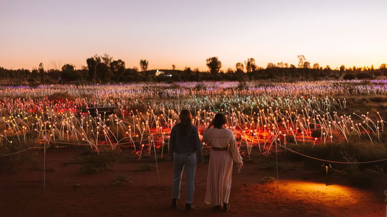 As evening rolls in, experience the desert sunset at the Uluṟu sunset viewing area - watch the colours of the rock shift from deep red to burnt orange or purchase a Field of Light star pass and wander through the desert illuminated by thousands of softly glowing lights
